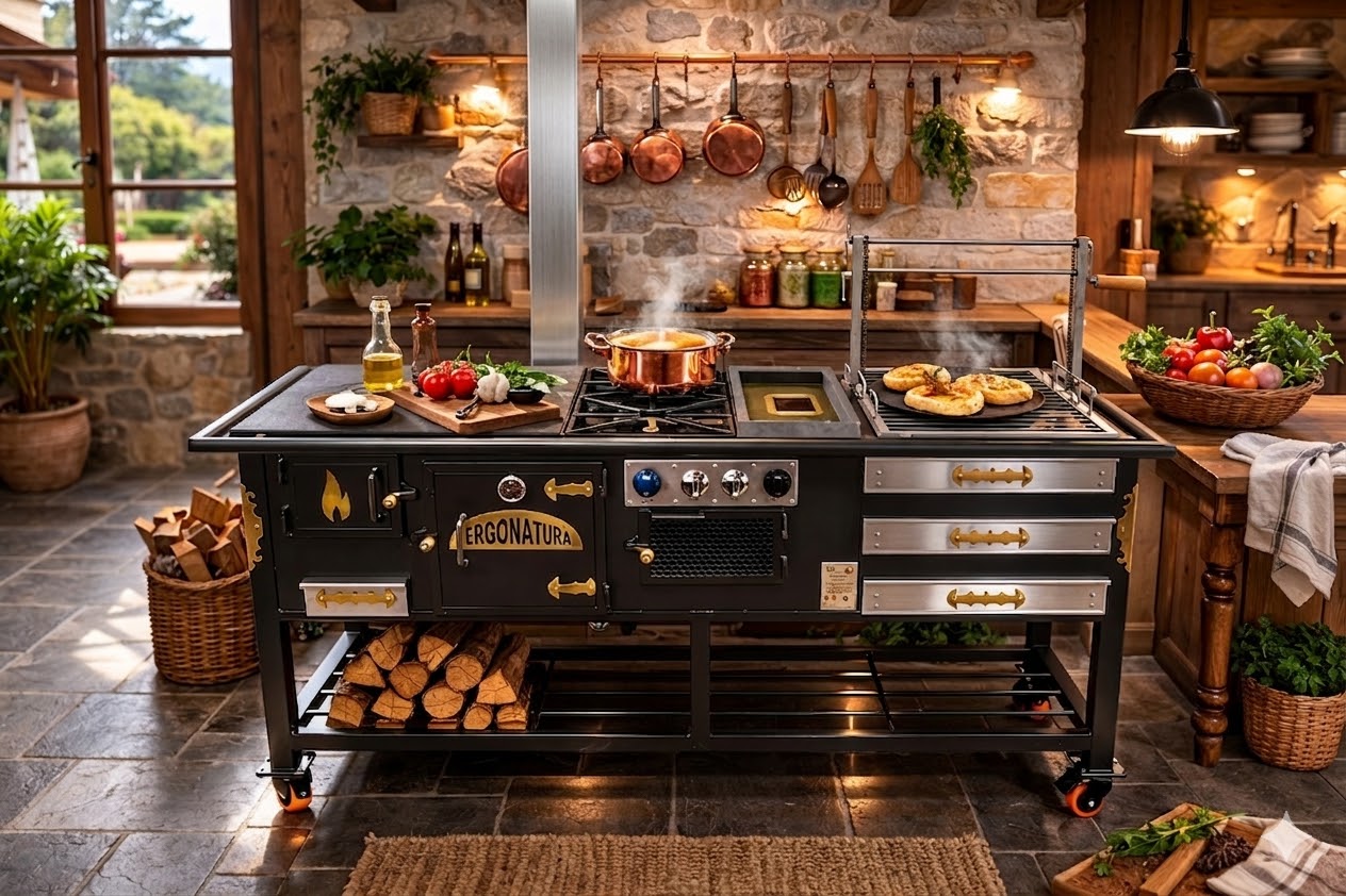 3 hornillas leña, 2 gas, horno híbrido y parrilla con elevación.