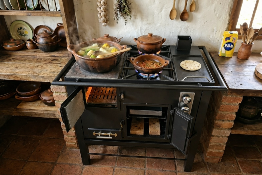 Un domingo tranquilo puedes poner a cocinar un sancocho o un caldo a fuego de leña, dejando que el sabor se desarrolle con calma. Pero si llega una visita inesperada o el tiempo es limitado, también puedes aprovechar las funciones adicionales que hacen la cocina más ágil. Y eso cambia completamente la experiencia: porque cocinar deja de ser una tarea complicada y se convierte en algo práctico, cómodo y agradable.