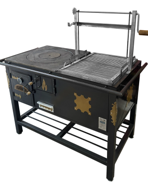 Estufa ecoeficiente La Ulloa con hornilla grande, horno y parrilla asadora con sistema de elevación. Ahorra 70% de leña y reduce 90% emisiones contaminantes.