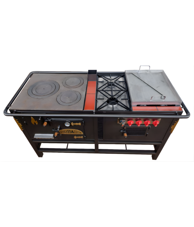 Estufa Gigante: 3 hornillas a leña, 2 fogones a gas, freidores, horno híbrido y parrilla BBQ. Resistente y completa para gastronomía y fincas.