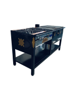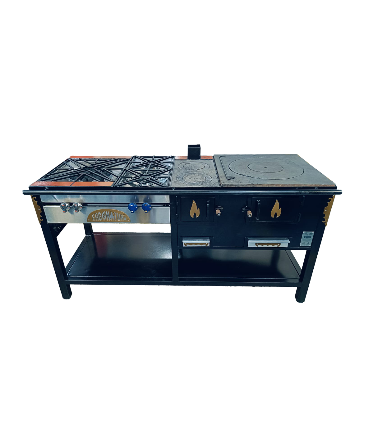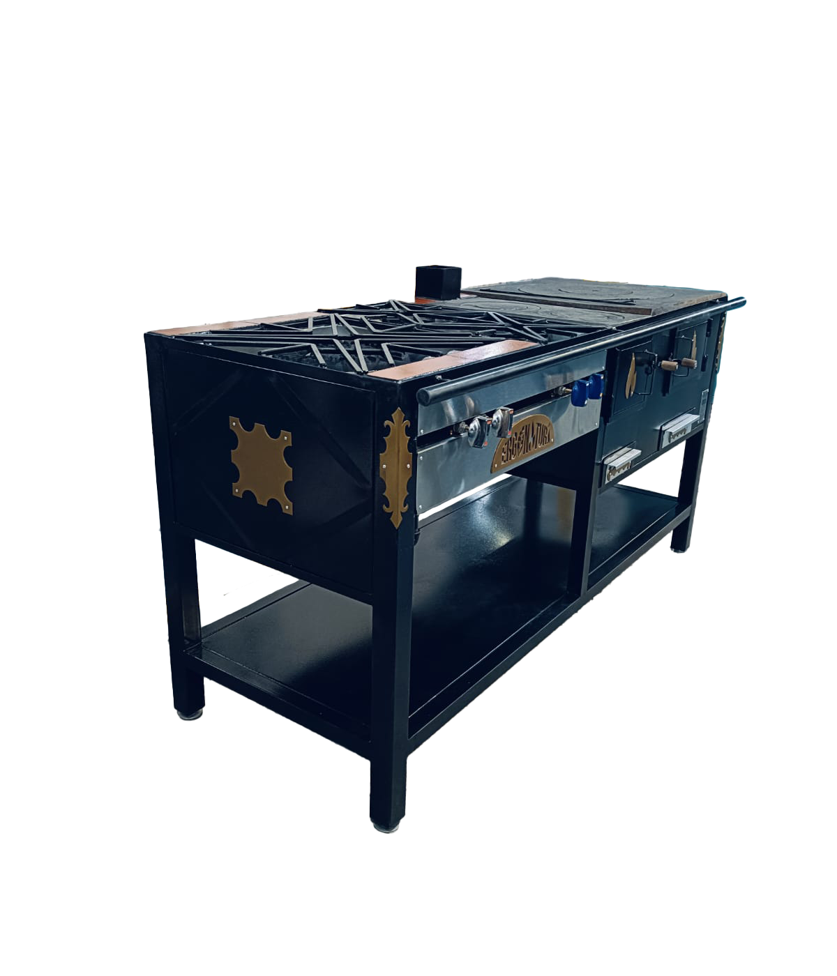 Estufa Gigante: 3 hornillas a leña, 2 fogones a gas, freidores, horno híbrido y parrilla BBQ. Resistente y completa para gastronomía y fincas.