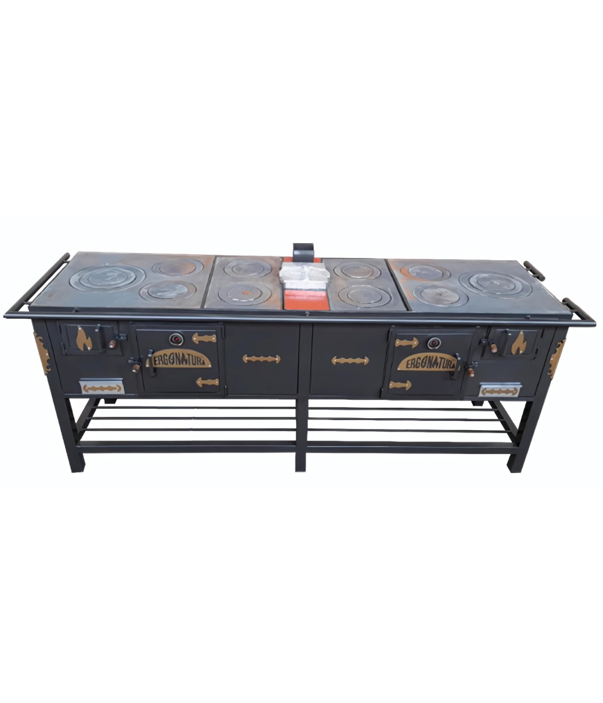 Estufa La Argentina tipo gastronomía: 6 hornillas a leña, horno integrado y plancha BBQ en hierro fundido. Diseñada para alto rendimiento en fincas y negocios, ahorra 70% de leña y reduce 90% emisiones contaminantes.