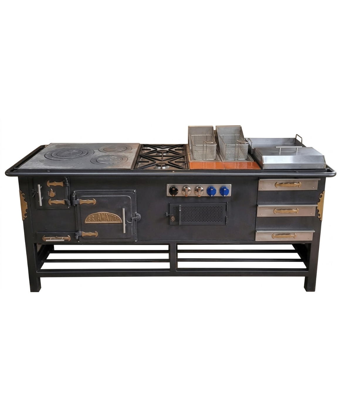 Estufa Gigante: 3 hornillas a leña, 2 fogones a gas, freidores, horno híbrido y parrilla BBQ. Resistente y completa para gastronomía y fincas.