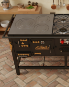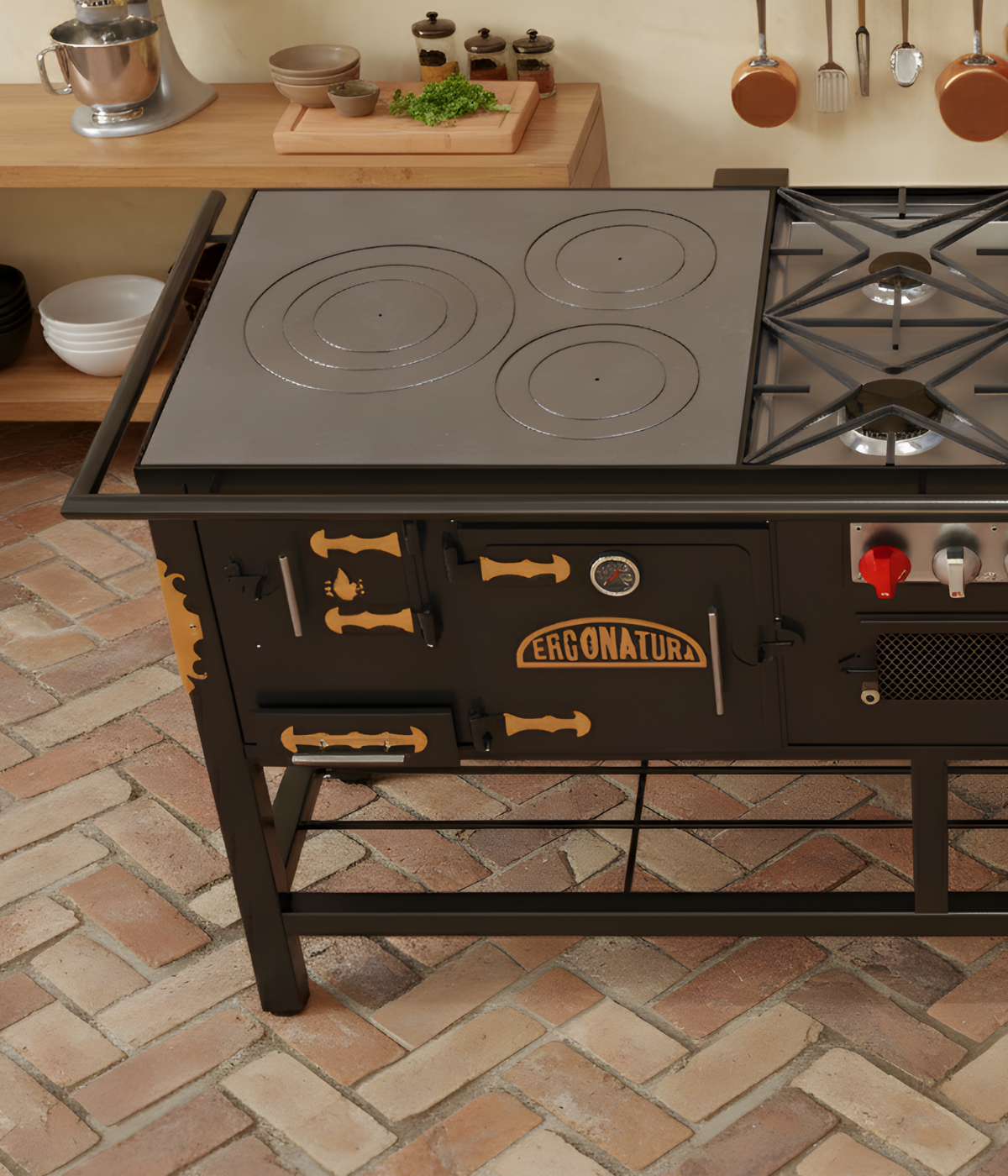Estufa Sanjuanera: gran formato para gastronomía, con horno híbrido, plancha BBQ, freidor y múltiples fogones a gas y leña. Potencia y versatilidad.