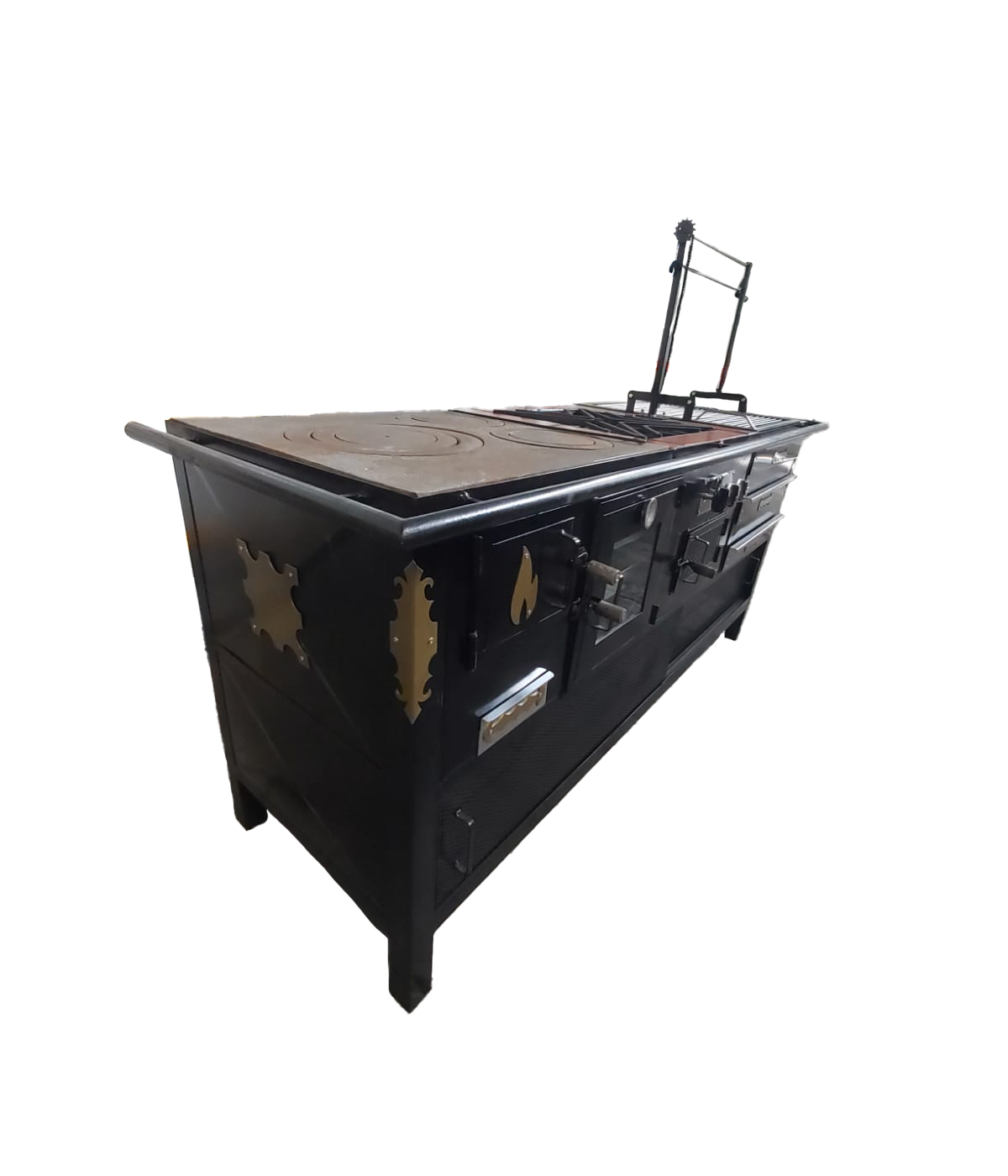 Estufa Gigante: 3 hornillas a leña, 2 fogones a gas, freidores, horno híbrido y parrilla BBQ. Resistente y completa para gastronomía y fincas.