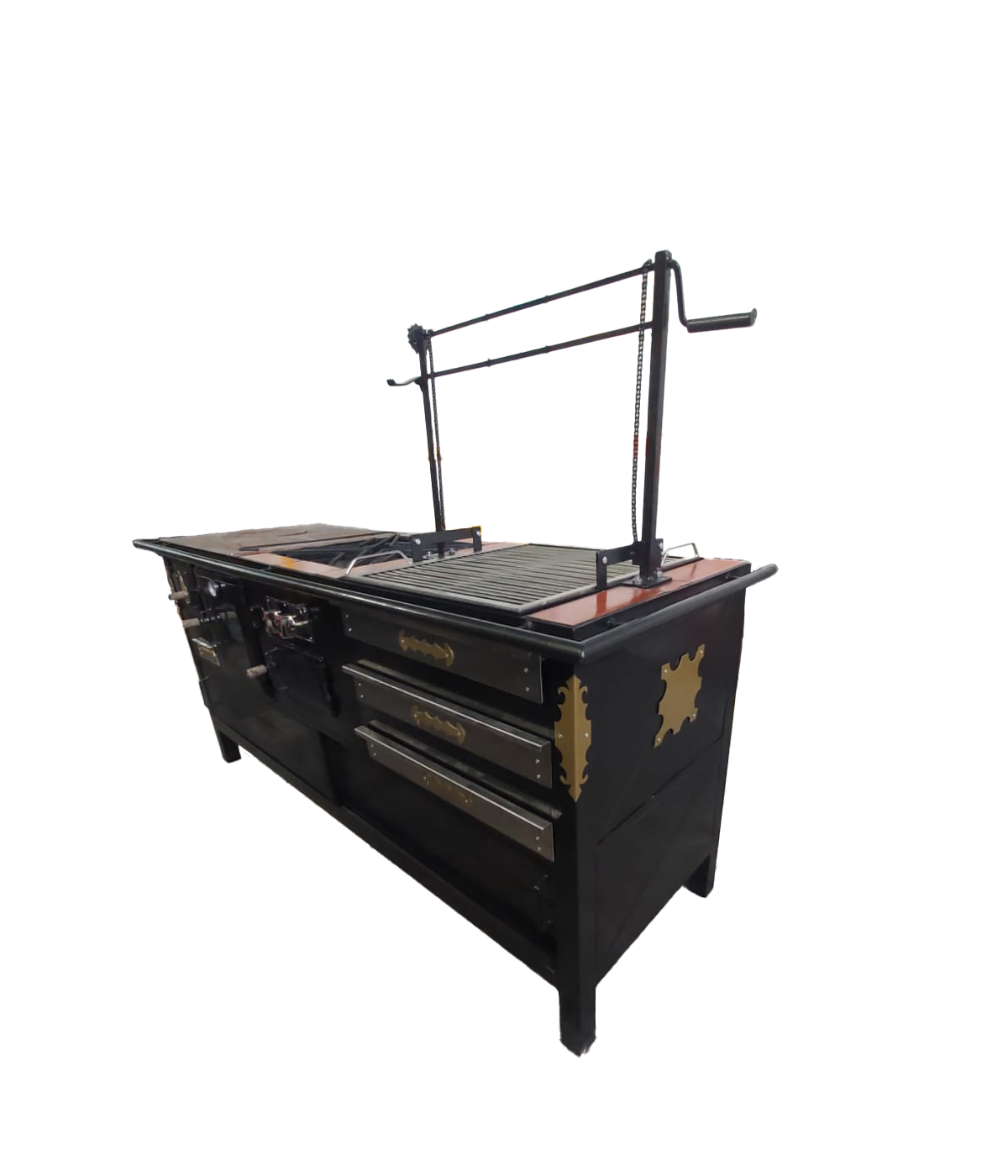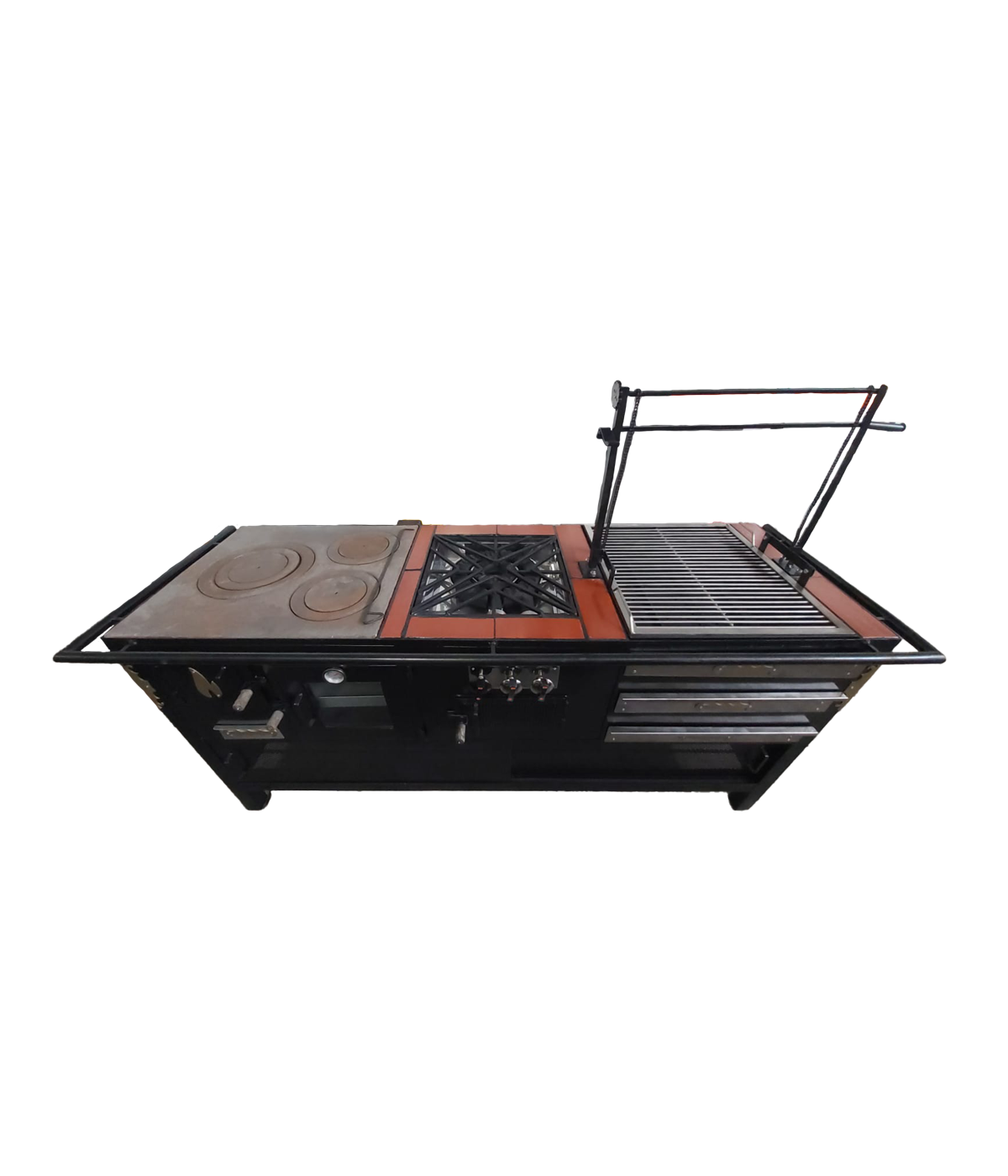 Estufa Sanjuanera modular: versatilidad total con módulos de gas, leña y parrilla BBQ. Ideal para negocios gastronómicos de gran capacidad.