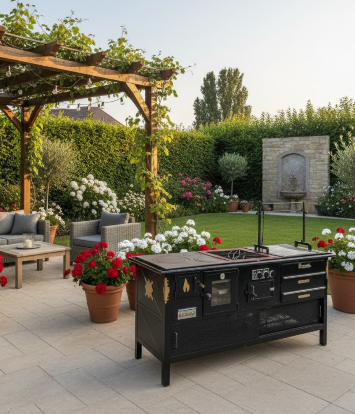 Estufa Guadalupe: 3 hornillas a leña, 2 fogones a gas, horno híbrido y parrilla BBQ con elevación. Ideal para gastronomía y fincas.