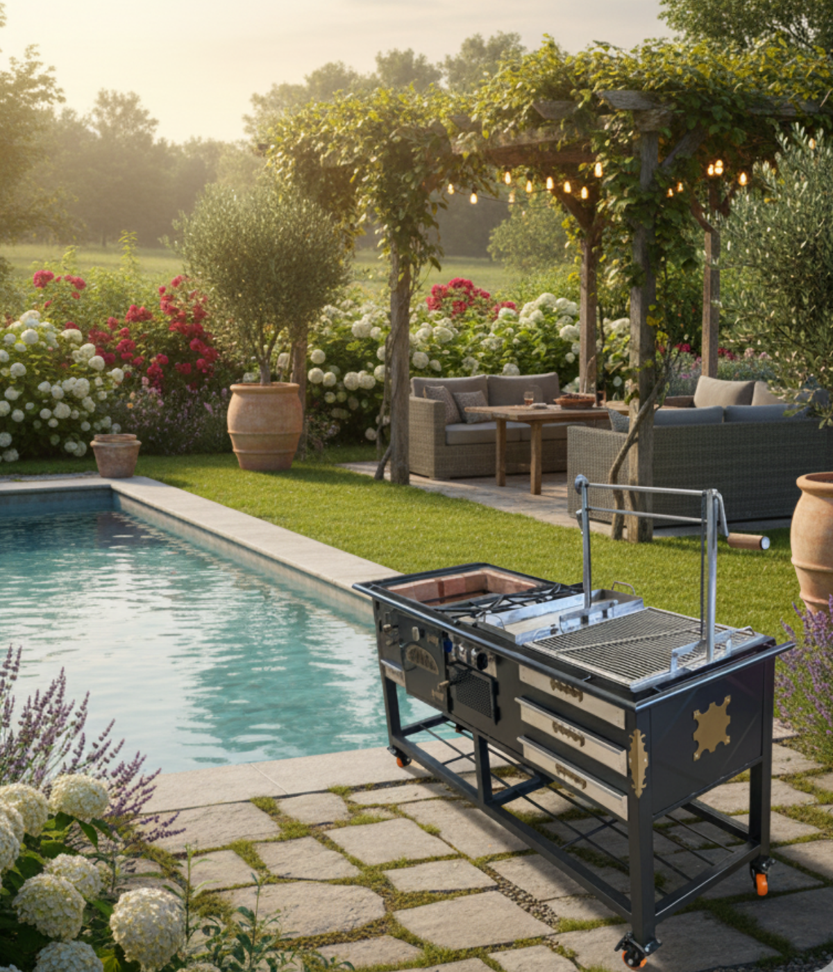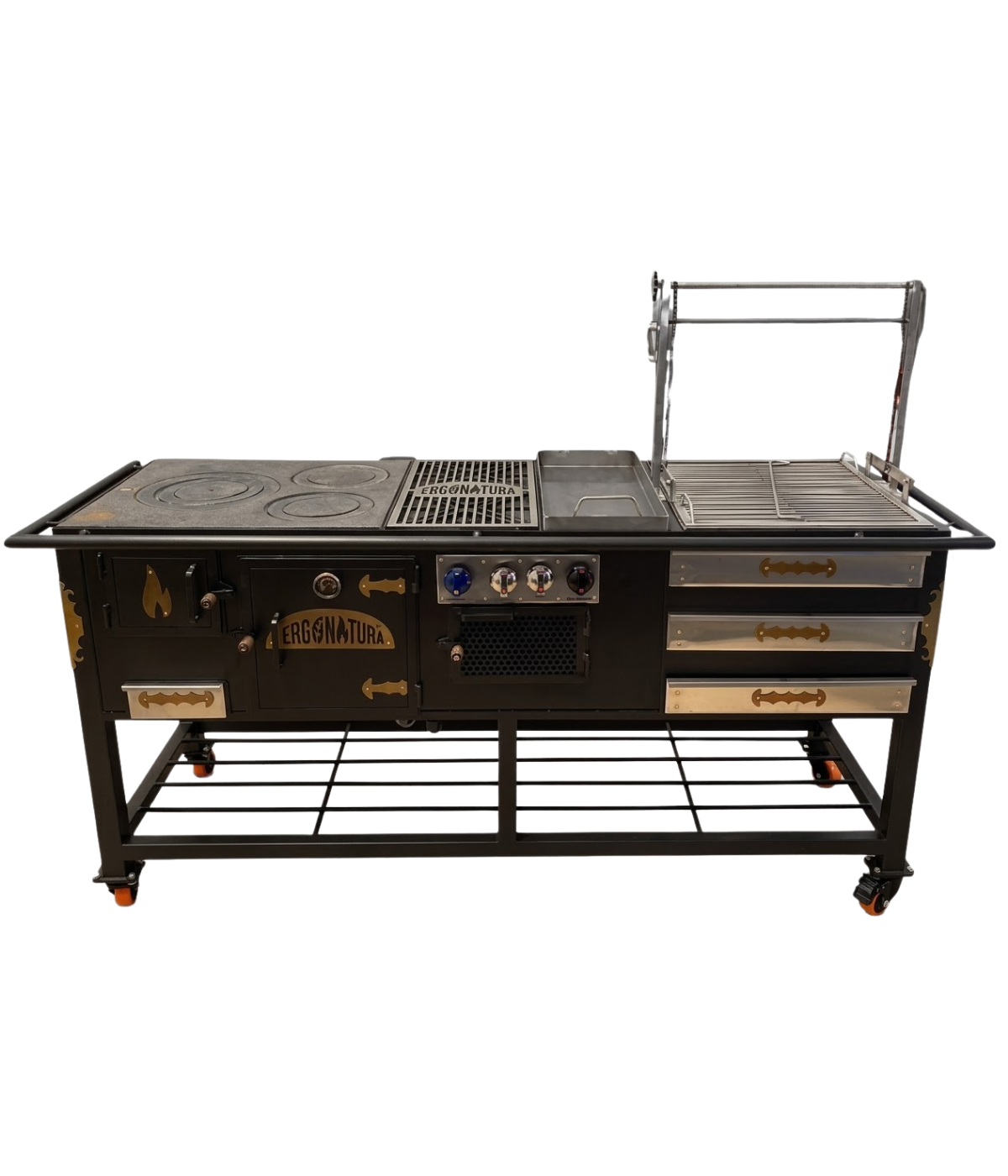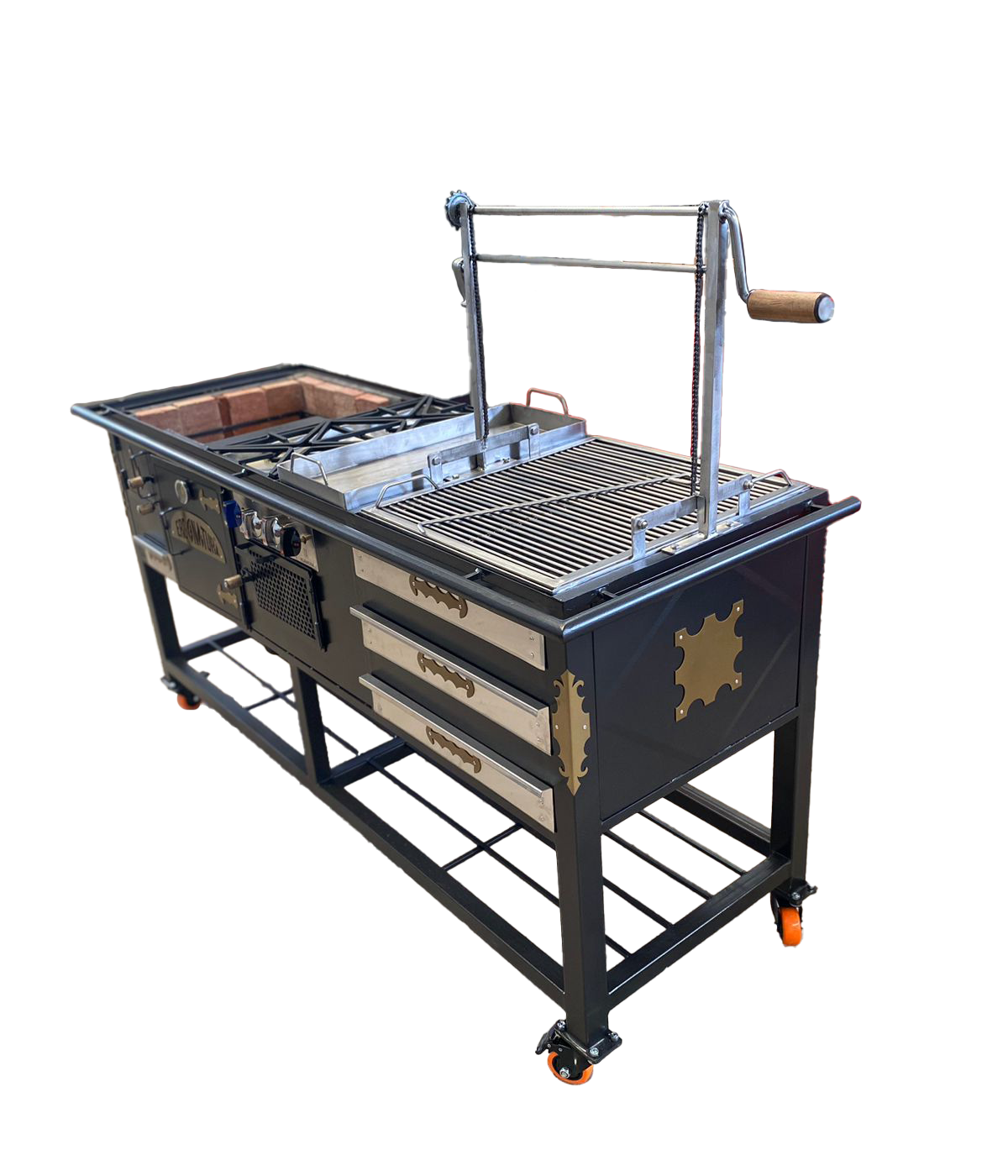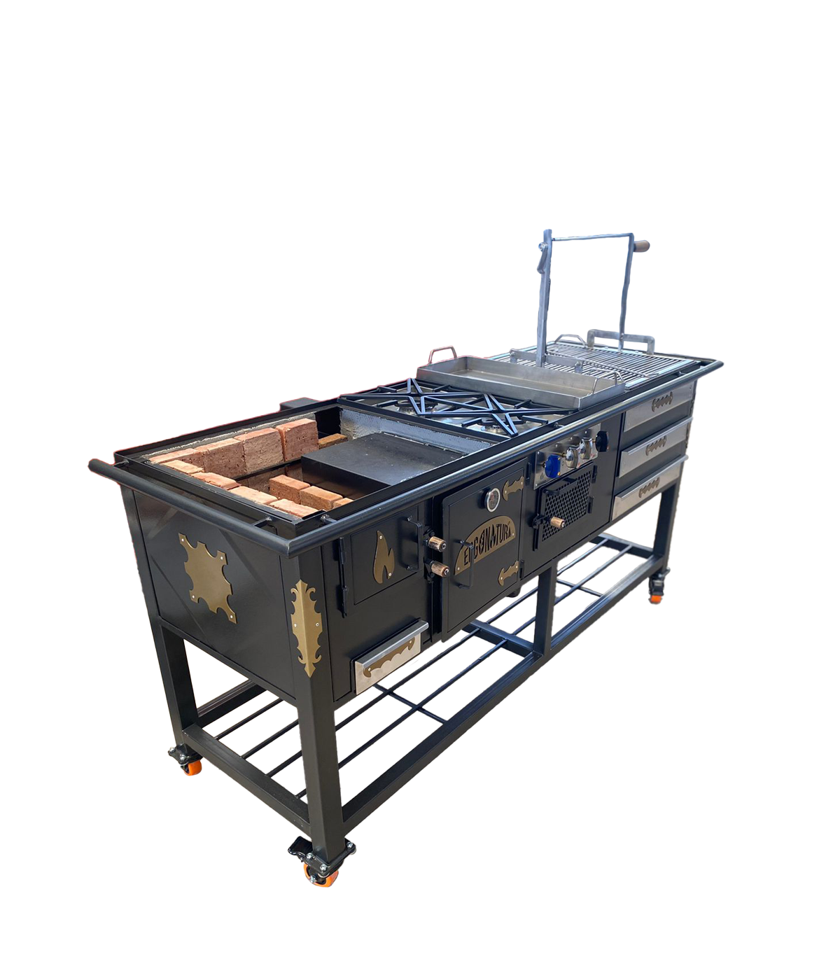 Estufa Sanjuanera modular: versatilidad total con módulos de gas, leña y parrilla BBQ. Ideal para negocios gastronómicos de gran capacidad.