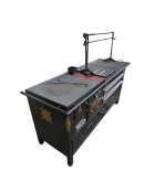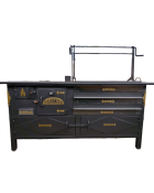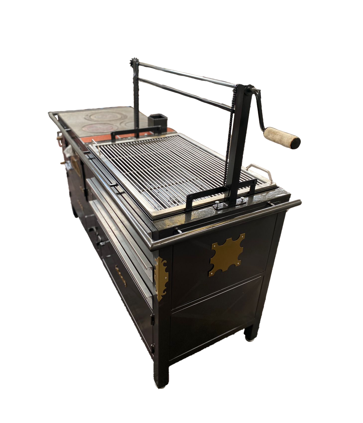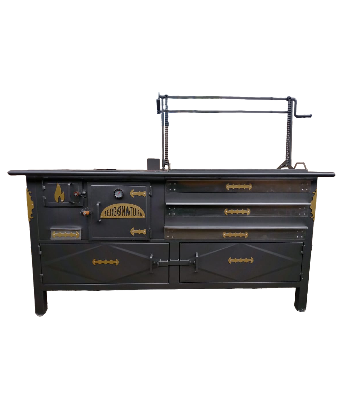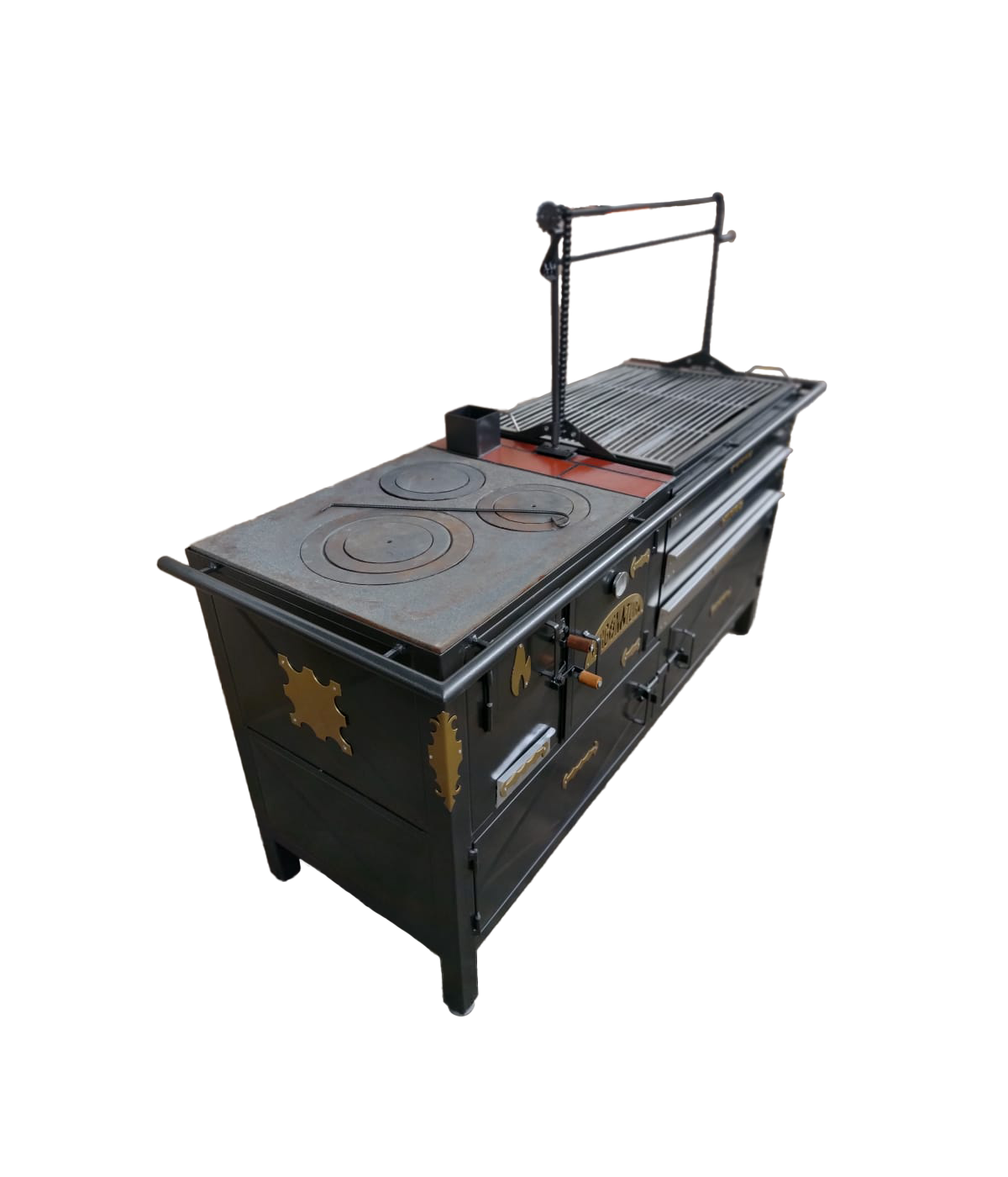 Estufa La Plata: 3 hornillas, horno a leña y gran parrilla BBQ con elevación. Resistente, ecoeficiente e ideal para gastronomía y eventos campestres.