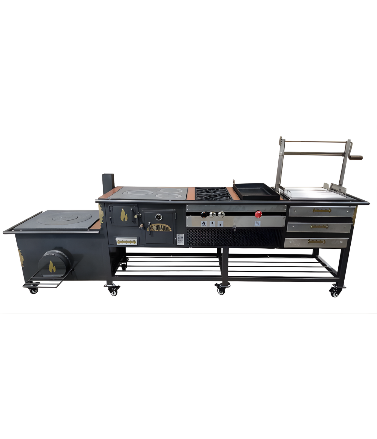 Estufa Gigante: 3 hornillas a leña, 2 fogones a gas, freidores, horno híbrido y parrilla BBQ. Resistente y completa para gastronomía y fincas.