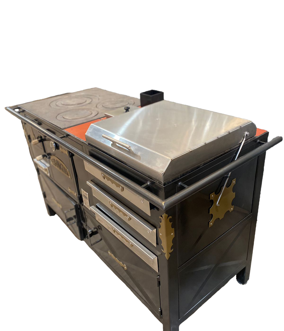 Estufa Tatacoa: 3 hornillas, horno a leña, calentador de agua y parrilla BBQ con tapa ahumadora. Ideal para fincas, práctica y ecoeficiente.