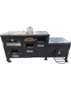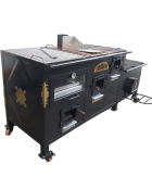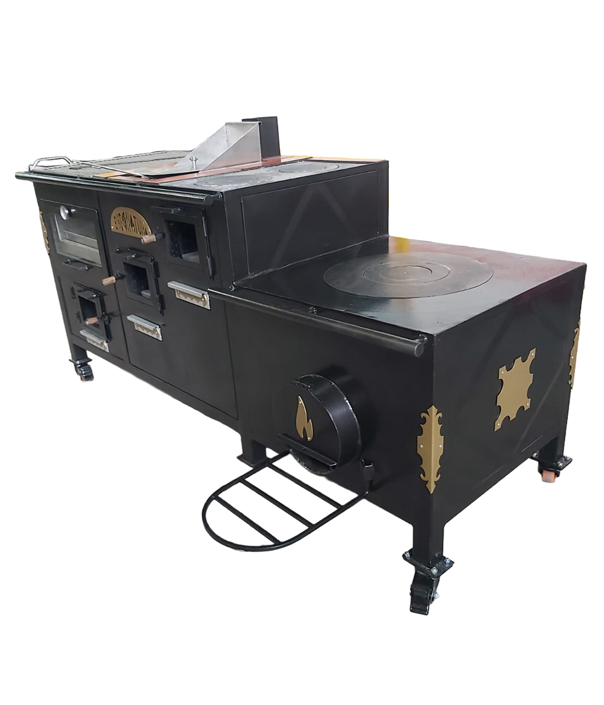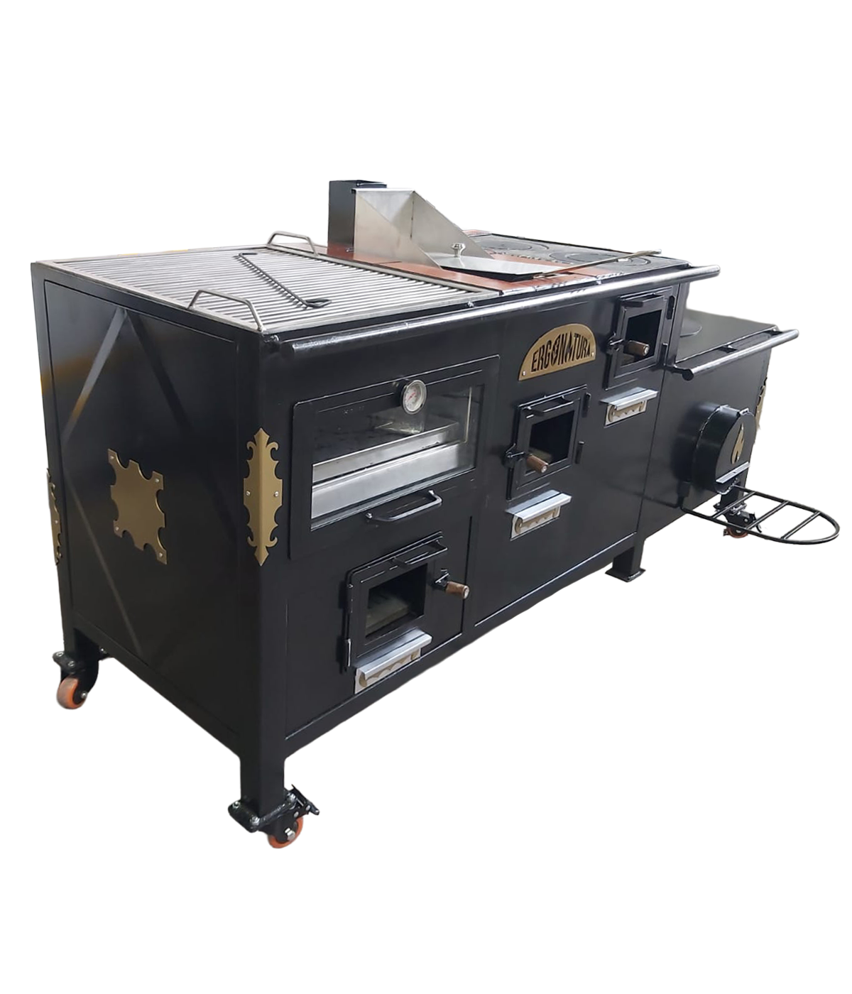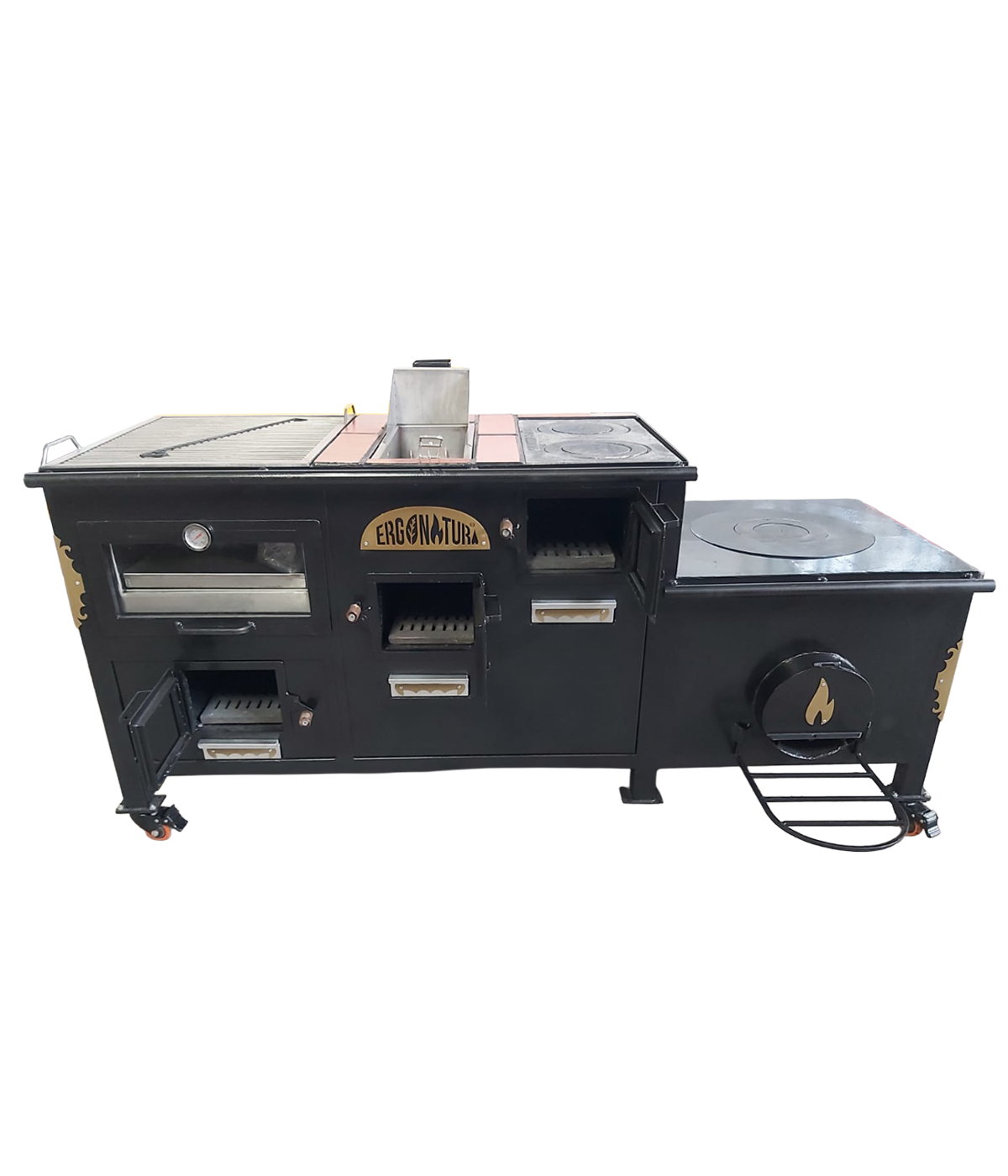 Estufa Tesalia: parrilla BBQ, horno chino a leña, freidor y hornilla rocket. Resistente y ecoeficiente, ideal para gastronomía y fincas.